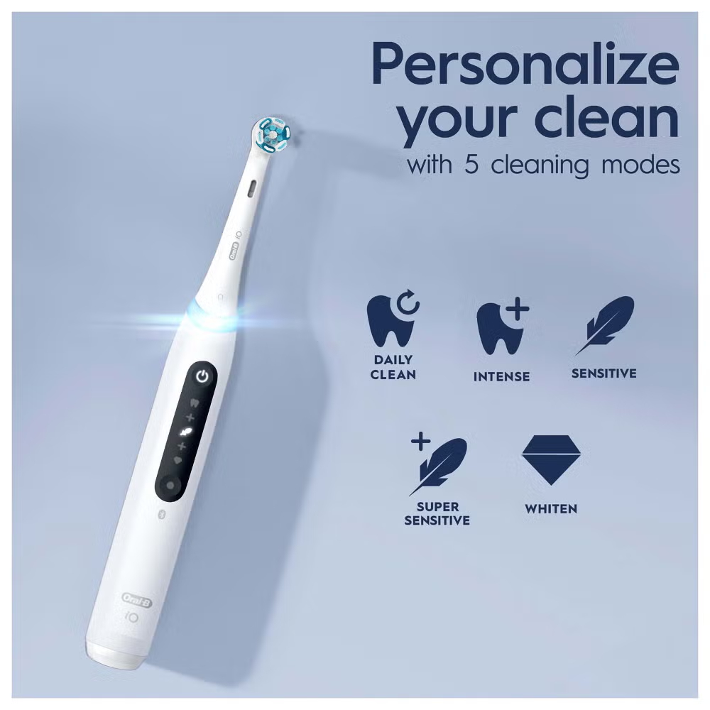 The iO 3 electric toothbrush features Oral-B’s best technology, combining a dentist-inspired round brush head with micro-vibrating bristles for a