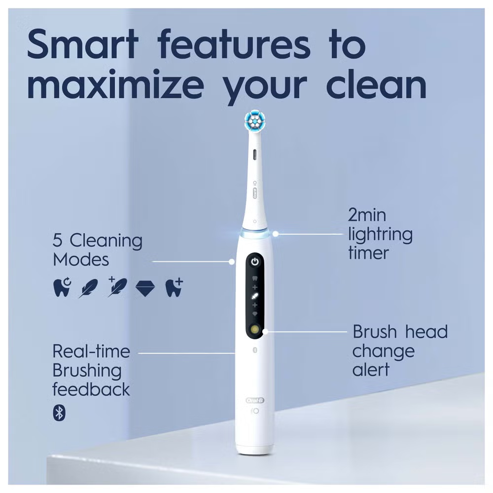 The iO 5 electric toothbrush features Oral-B’s best technology, combining a dentist-inspired round brush head with micro-vibrating bristles for a professional purifying clean feel at home. The Smart Pressure Sensor helps prevent you from brushing either too hard or too softly to better protect your gums. A.I. Brushing Recognition recognises your brushing style and guides you to better brushing every day. Connects to the free Oral-B App for real-time brush tracking & guidance across 6 brushing zones. Replace your Oral-B iO toothbrush head every 3 months for the best results.