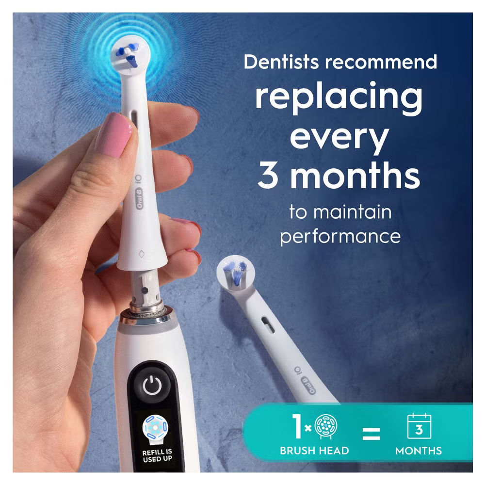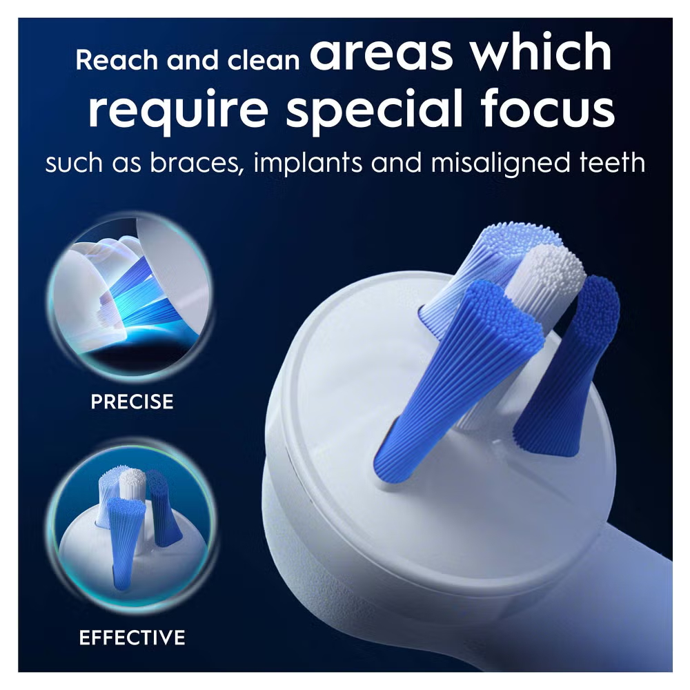 The Oral-B iO Series Interdental Clean Replacement Brush Heads feature an innovative tuft pattern, developed with dental professionals, that packs high bristle density into a focused design to effectively access and clean hard-to-reach areas. The outer tufts angle inward to support the taller central tuft, enabling targeted reach to areas that require special focus – whether around orthodontic treatments, dental implants, or other hard-to-reach areas requiring extra care. Ideal for people with specialised oral hygiene needs who wish to avoid plaque-related complications. Oral-B Interdental Clean brush heads are designed exclusively for Oral-B iO electric toothbrush handles. Dentists recommend changing your toothbrush head every 3 months for best results. Enjoy superior cleaning power with the only refill brush heads designed exclusively for – and guaranteed to fit – your Oral-B iO electric toothbrush.