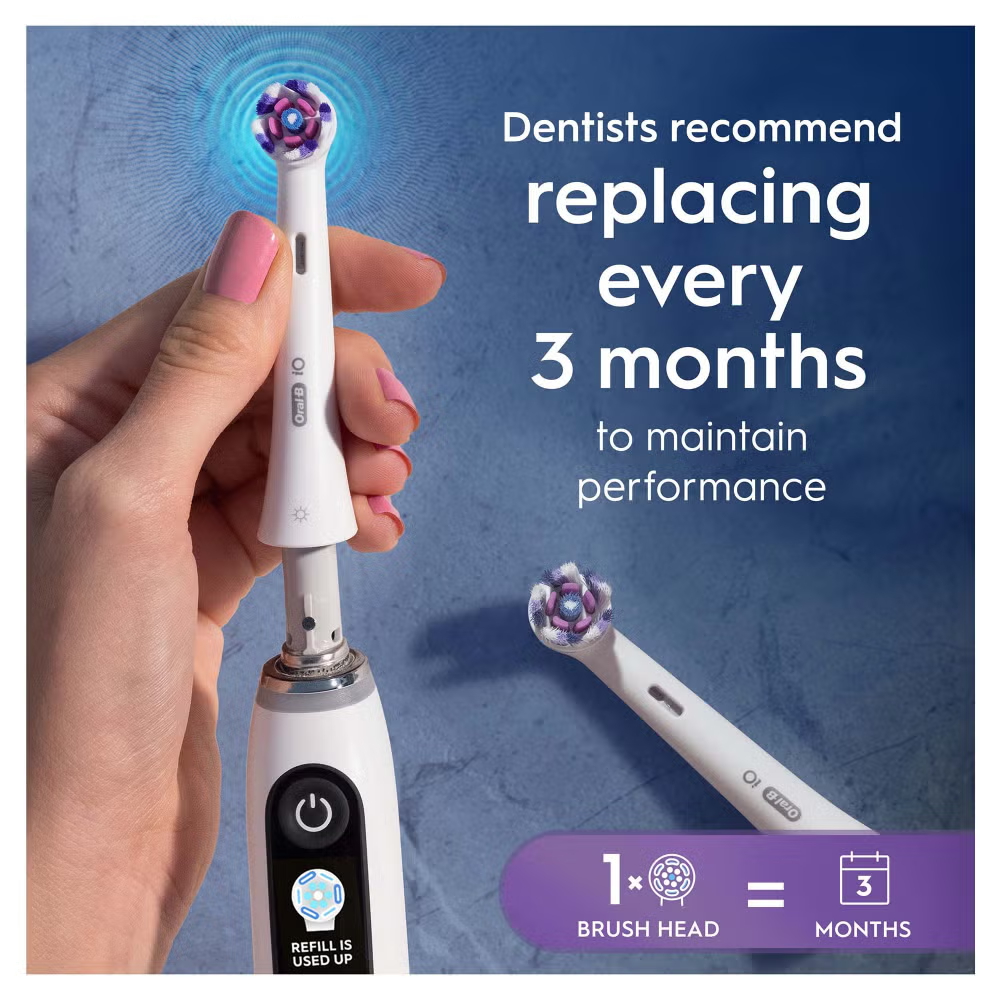 The Oral-B iO Series Radiant White Replacement Brush Heads combine powerful but gentle micro-vibrations with our unique, dentist-inspired round brush head design for a professional clean feeling every day. Designed exclusively for Oral-B iO electric toothbrush handles, the Radiant White brush heads help remove up to 100% more plaque than a regular, manual toothbrush, leaving teeth feeling clean and bright. The Radiant White brush head uniquely combines perfect angle bristles with polishing petals to contact and polish all areas and remove surface stains for a whiter smile. Dentists recommend changing your toothbrush head every 3 months for best results. Enjoy superior cleaning power with the only refill brush heads designed exclusively for – and guaranteed to fit – your Oral-B iO electric toothbrush.