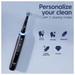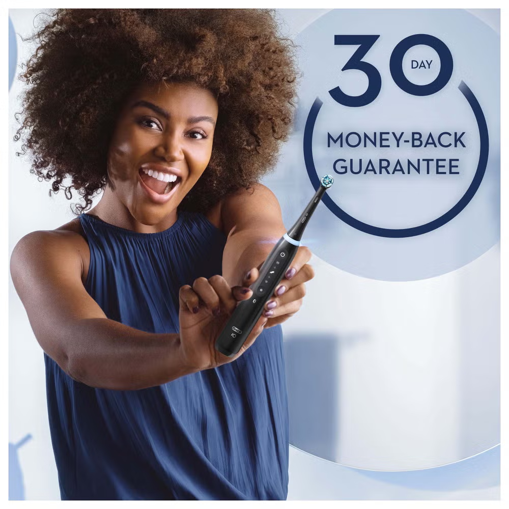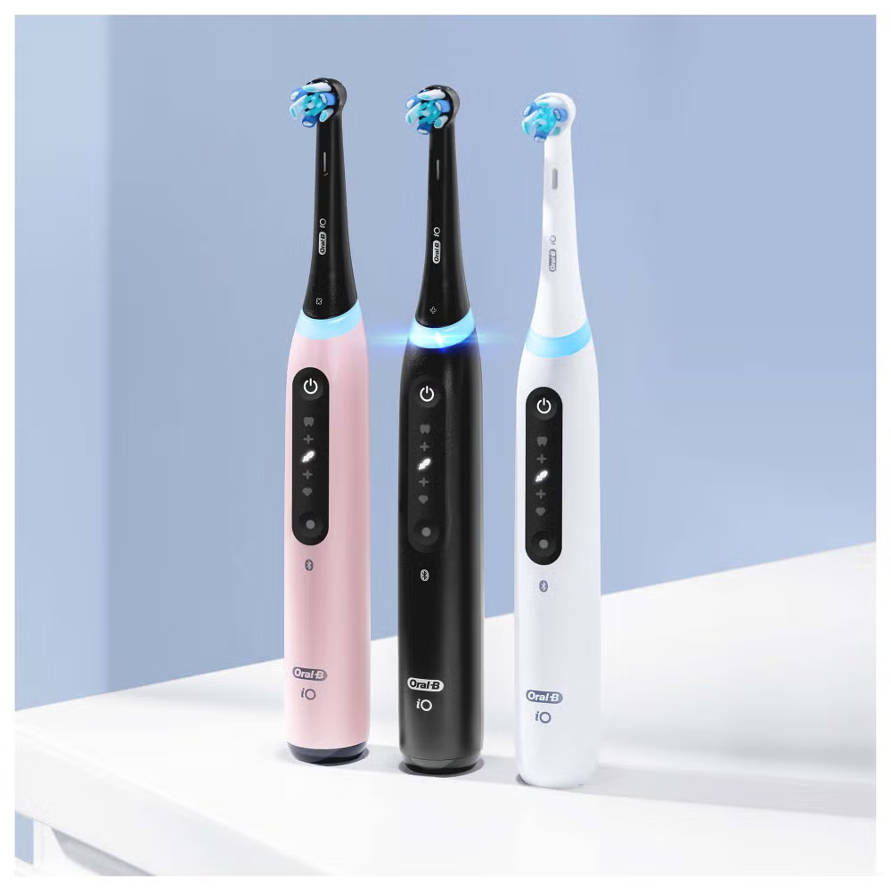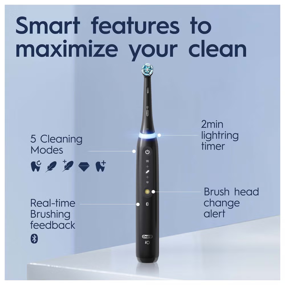 The iO 5 electric toothbrush features Oral-B’s best technology, combining a dentist-inspired round brush head with micro-vibrating bristles for a