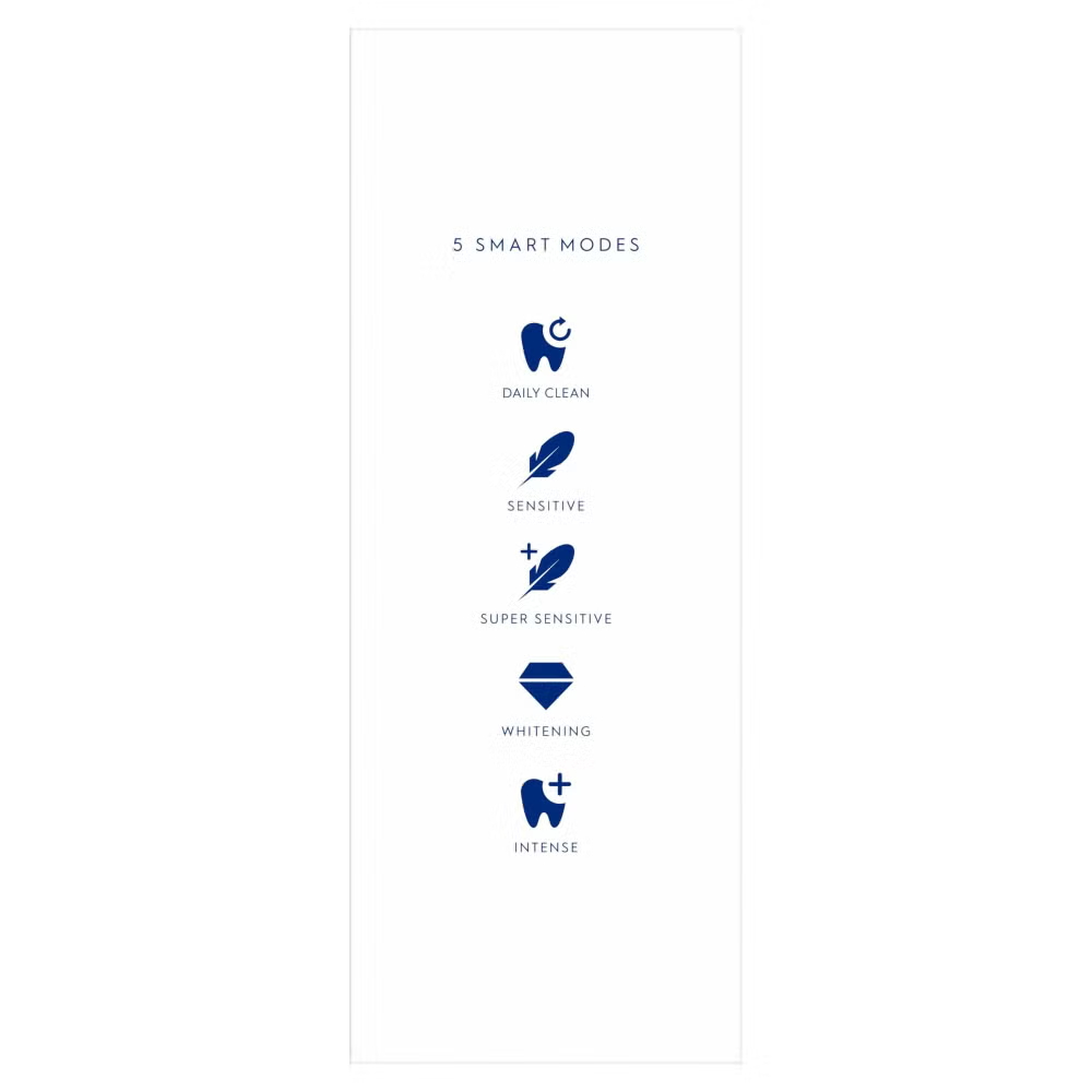 Person holding electric toothbrush with 5 smart modes: Daily Clean, Intense, Whitening, Sensitive, Super Sensitive