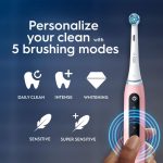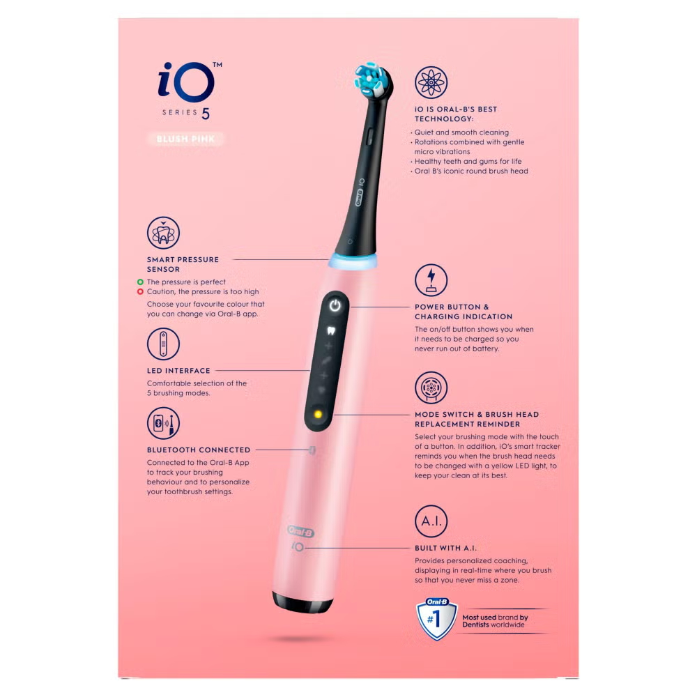 The iO 5 electric toothbrush features Oral-B’s best technology, combining a dentist-inspired round brush head with micro-vibrating bristles for a