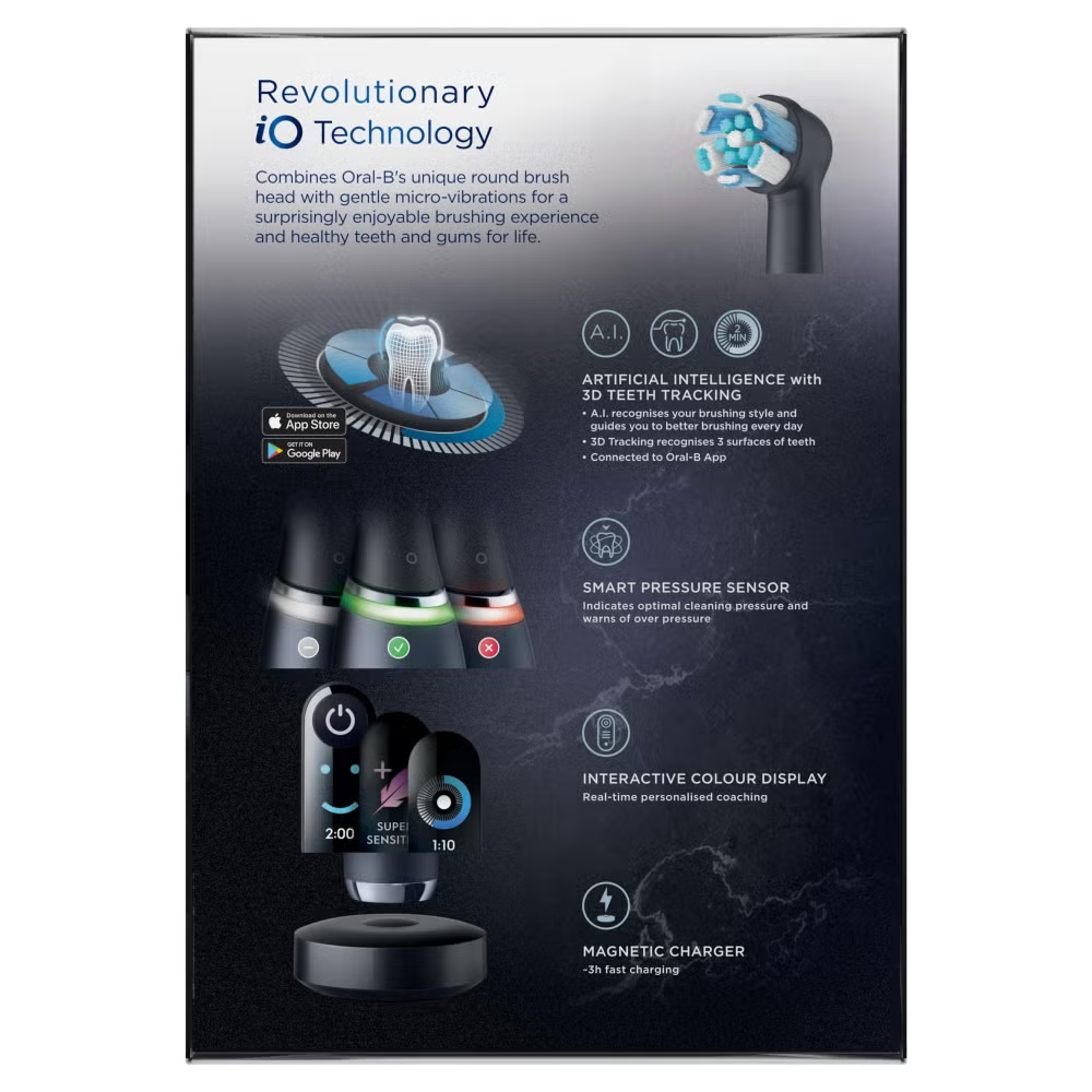 The iO 10 electric toothbrush with the revolutionary iO Sense smart charger personalises your brushing with real-time feedback, guiding you