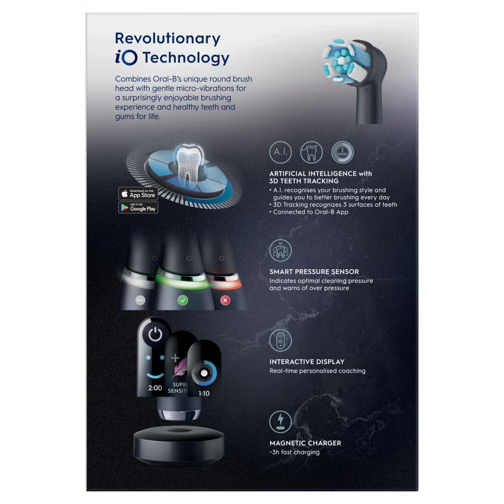 The iO 10 electric toothbrush with the revolutionary iO Sense smart charger personalises your brushing with real-time feedback, guiding you
