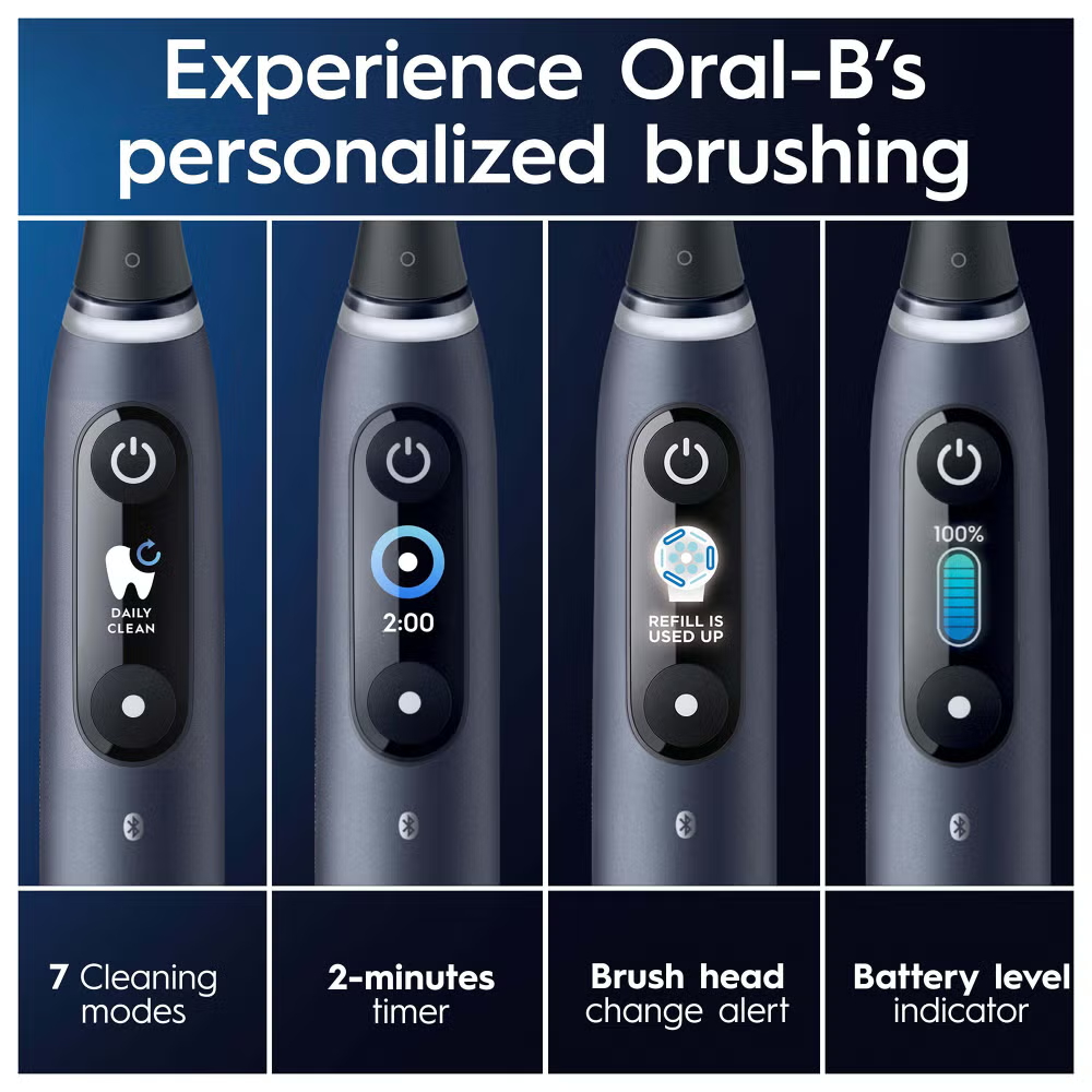 The iO 5 electric toothbrush features Oral-B’s best technology, combining a dentist-inspired round brush head with micro-vibrating bristles for a