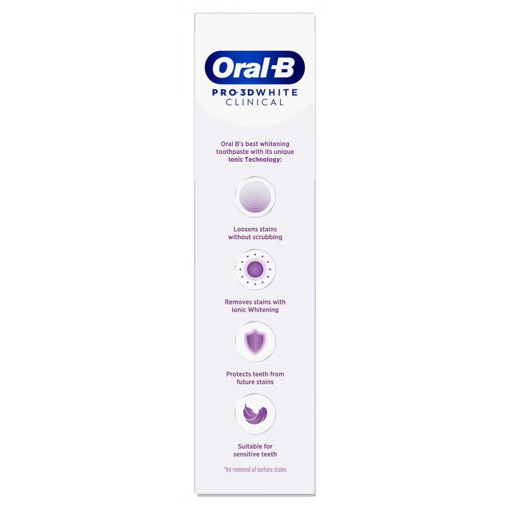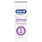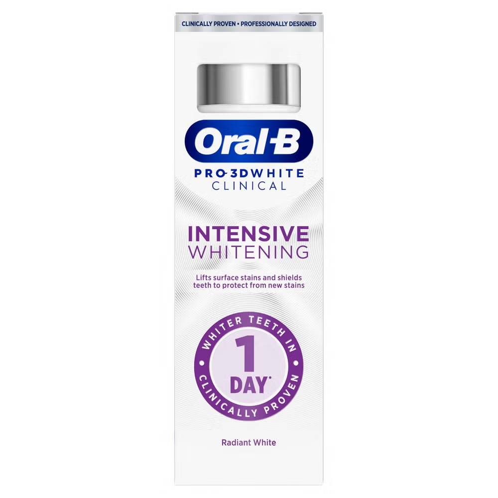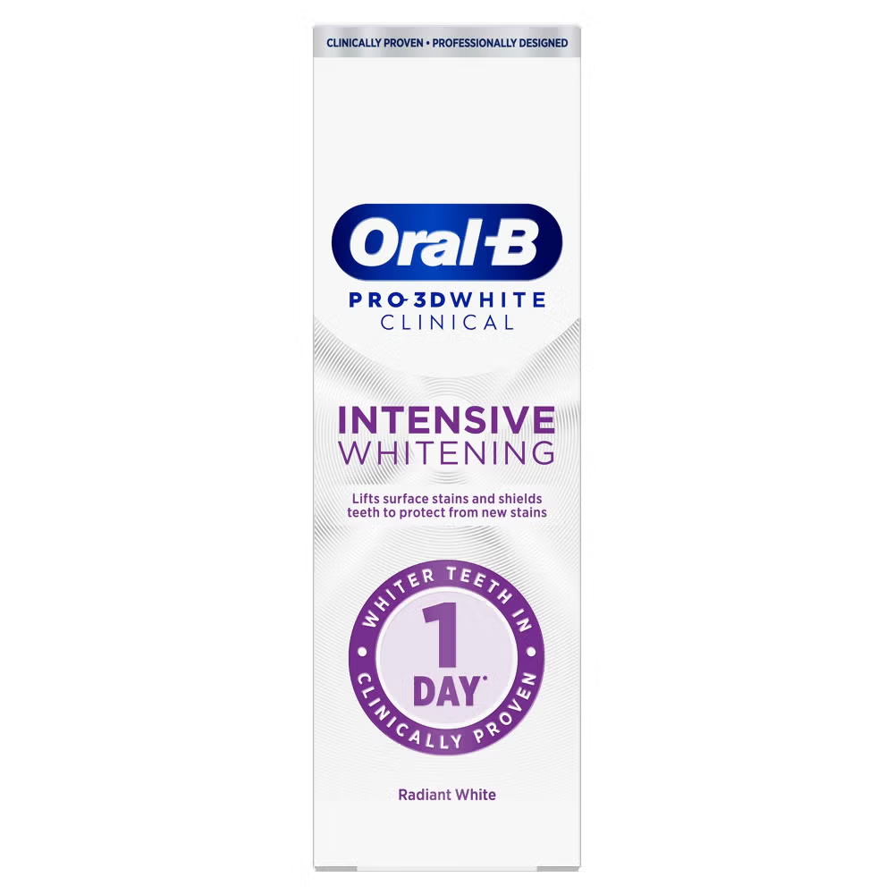 Oral-B Pro 3D White Clinical Intensive Whitening toothpaste is clinically proven for whiter teeth in 1 day by removal of surface stains. It is Oral-B’s best whitening toothpaste with its unique Ionic Technology: It loosens stains without scrubbing, removes stains with Ionic Whitening, protects teeth from future stains and is suitable for sensitive teeth.